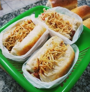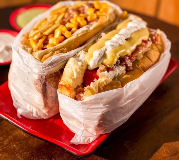 Pão tradicional, salsicha, milho, Batata palha, ketchup e maionese