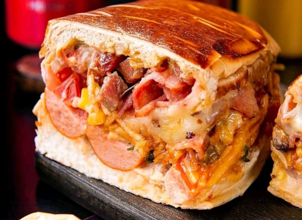 Pão tradicional, 2 salsichas, bacon, calabresa, purê, cheddar, milho, batata palha e kethcup